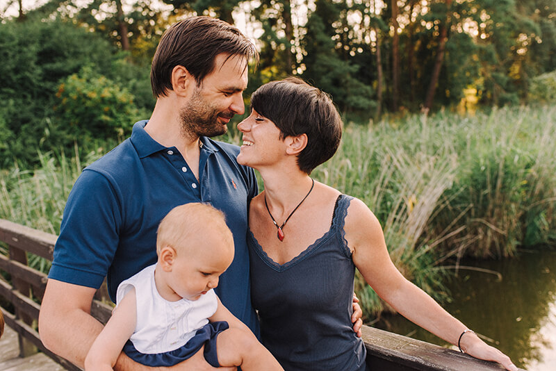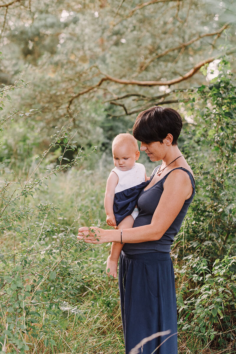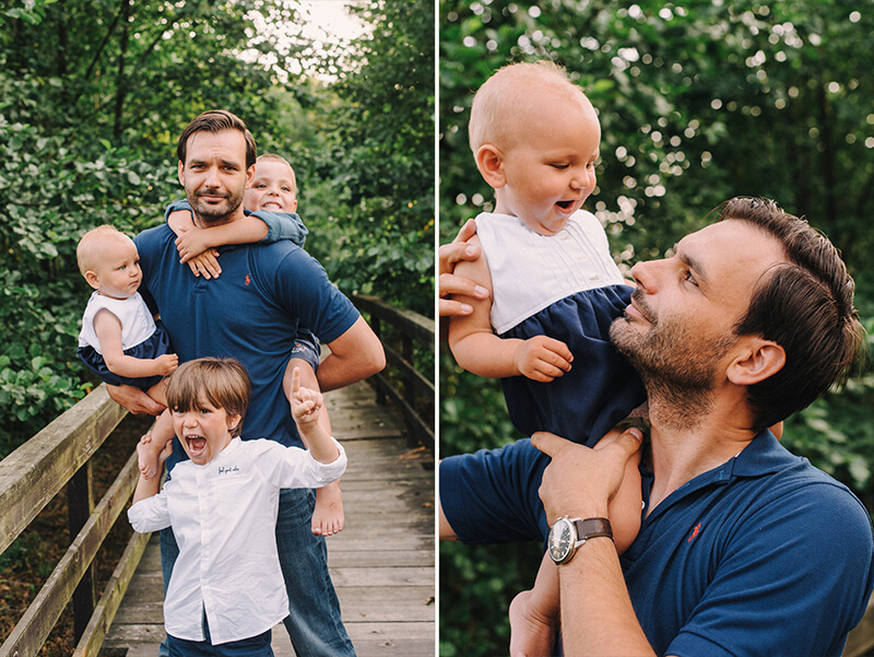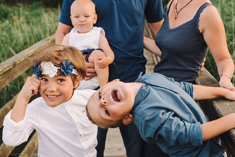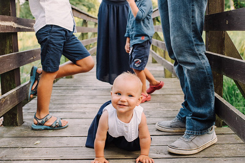 Gosia: Na naszą sesję umówiliśmy się w gorący letni wieczór w plenerze i to najlepiej bardzo różnorodnym by uwaga naszej dzieciarni mogła być wciąż czymś zajęta :) To miała być nasza pierwsza sesja w powiększonym składzie co oczywiście bardzo nas cieszyło jak i budziło niepokój bo ogarnięcie trójki maluchów to nie lada wyzwanie. Ponadto pora wieczorowa to w naszej rodzinie czas przygotowań do snu, a na dodatek tego dnia nasza Polcia miała bardzo słaby humor, bo właśnie wyżynały jej się zęby … tak więc na zdjęcia jechaliśmy z dużą dozą niepewności i lekkim stresem czy w ogóle uda się coś fajnego zrobić … Jak się na szczęście okazało miejsce było strzałem w dziesiątkę (Łysy Młyn), dzieciaki miały mega frajdę odkrywając starą łódkę, mosty i mosteczki, bagna, łąki i pszczoły :) Miały przestrzeń by poszaleć i się wybiegać.